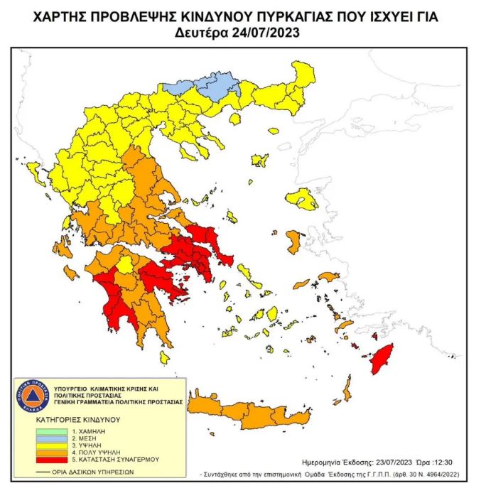 Με αφορμή την πρόβλεψη της Πολιτικής Προστασίας για Ακραίο κίνδυνο φωτιάς – Κατάσταση Συναγερμού (κατηγορία κινδύνου 5) για σήμερα Δευτέρα 24 Ιουλίου 2023, στην ευρύτερη περιοχή της Ιεράς Μητρόπολης Ύδρας, Σπετσών και Αιγίνης, με Ανακοίνωση της η Μητρόπολη συστήνει σε όλους την πιστή τήρηση των προβλεπόμενων μέτρων και την απαγόρευση της κυκλοφορίας σε δάση, άλση και πευκώνες.