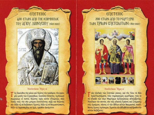 Στην τρίτη σελίδα, αναφέρεται ο εορτασμός για τα 400 χρόνια από την κοίμηση του Αγίου Διονυσίου εκ Ζακύνθου, Επισκόπου Αιγίνης, ενώ στην τέταρτη σελίδα γίνεται αναφορά στα 200 χρόνια από το μαρτύριο των Τριών Σπετσιωτών Αγίων.