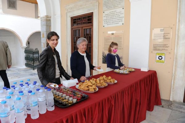Ακολούθησε ευχαριστήρια προσλαλιά του π. Ακινδύνου και παρετέθη κέρασμα για όλους στον Νάρθηκα λόγω των μέτρων.