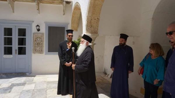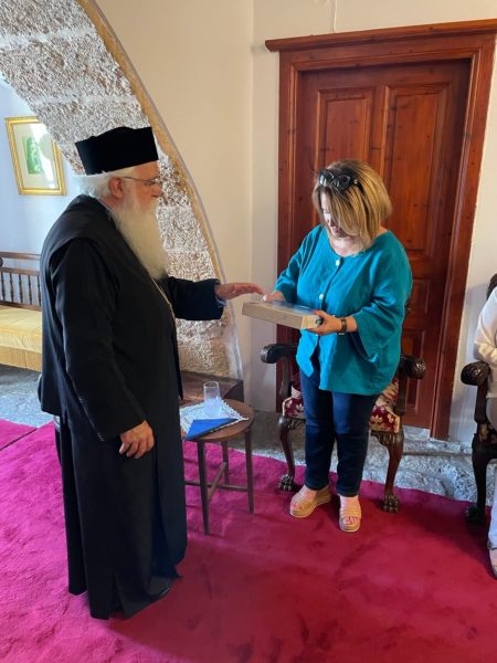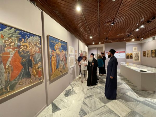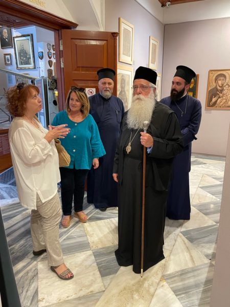 Ο Σεβασμιώτατος ξεναγήθηκε στην έκθεση από την κ. Μ. Νάνου και συναντήθηκε στο γραφείο της Διευθύντριας του Ι.Α.Μ.Υ κ. Κων. Αδαμοπούλου όπου η κ. Διευθύντρια προσέφερε αναμνηστικά δώρα.