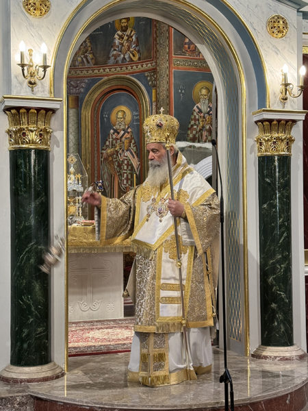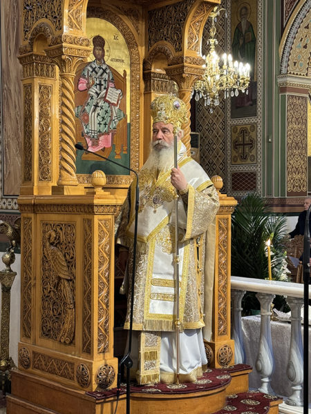 Στο κήρυγμά του ο Σεβασμιώτατος, αναφέρθηκε στην ευαγγελική περικοπή της ημέρας, όπου μια μάνα βασανισμένη και βαθιά τυραννισμένη, ζητάει βοήθεια από τον Χριστό για την κόρη της που υπέφερε από δαιμόνιο. Και βλέπουμε τον Χριστό να μένει αδιάφορος στην πονεμένη αυτή φωνή, να μην δίνει σημασία και να την προσπερνάει.