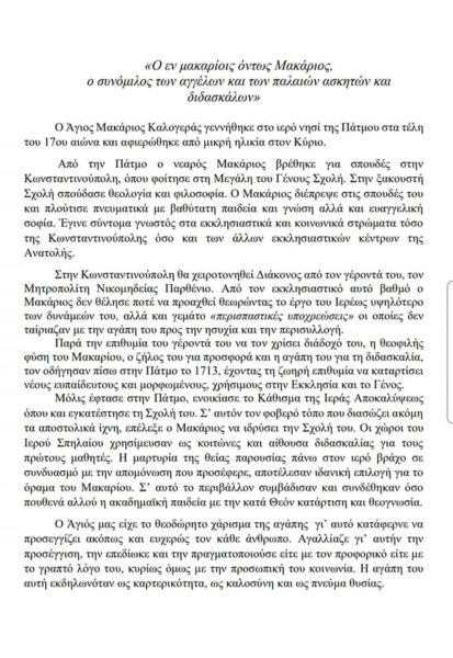 Όπως γράψαμε και χθες, η 19η ημέρα του Ιανουαρίου είναι μια σπουδαία ημέρα για την Πατμιάδα του Γένους Εκκλησιαστική Σχολή, διότι εορτάζει ο ιδρυτής της, Άγιος Μακάριος ο Καλογεράς, που επιτέλεσε θεάρεστο έργο τόσο για τη μάθηση των παιδιών όσο και για την μεγάλη υποστήριξη του ελληνικού έθνους και της Ορθοδοξίας.