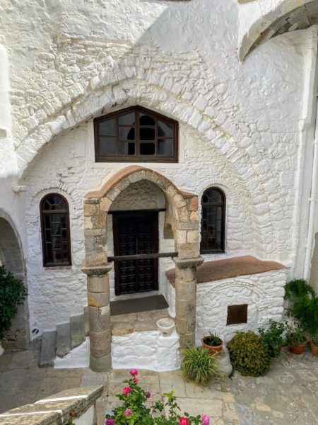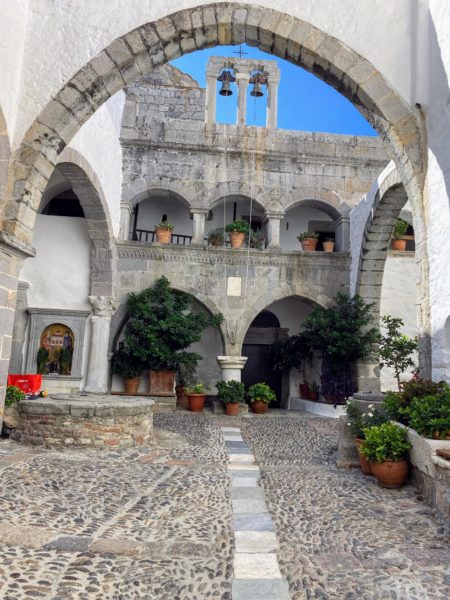 Η Ιερά Μονή του Ιωάννη του Θεολόγου, που στέκεται σαν κορώνα στην κορυφή του λόφου, στο υψηλότερο σημείο της Χώρας, θυμίζει κάστρο και είναι ορατή από οποιοδήποτε άλλο σημείο του νησιού.