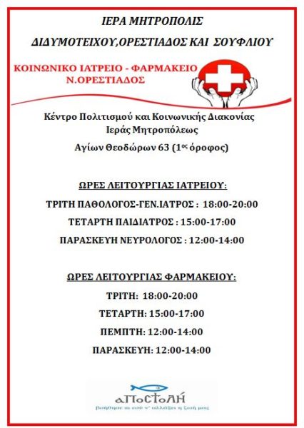 Ενημερωθείτε για τις ώρες λειτουργίας του Κοινωνικού Ιατρείου και Φαρμακείου της Ιεράς Μητροπόλεως Διδυμοτείχου, Ορεστιάδος και Σουφλίου ΕΔΩ