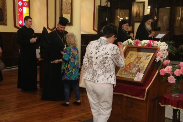 Ο οικείος Μητροπολίτης κ. Κυπριανός, πλαισιούμενος από τον ιερό κλήρο και το λαό της πόλεως, υποδέχθηκε την Ιερά Εικόνα στον Ιερό Ναό Κοιμήσεως Θεοτόκου του Καζανλάκ, παρουσία της Δημάρχου Γκαλίνας Στογιάνοβα. Τον Σεβασμιώτατο Μητροπολίτη κ. Δαμασκηνό συνόδευε ο Δήμαρχος της αδελφοποιημένης με το Καζανλάκ πόλεως του Διδυμοτείχου Ρωμύλος Χατζηγιάννογλου.
