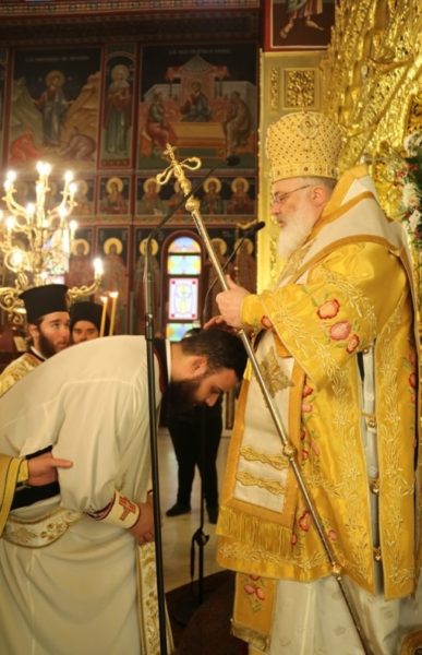 Ο Σεβασμιώτατος προσφωνώντας τον χειροτονούμενο είπε: «Η συνάντηση του αγίου Συμεών με τον τεσσαρακονθήμερο Κύριο λειτουργεί και για εμάς τους κληρικούς παραδειγματικά. Τούτο σημαίνει ότι όπως συναντήθηκε τότε ο άγιος Συμεών με τον Χριστό, έτσι καλούμεθα και εμείς να συναντηθούμε μαζί Του, μέσα στην Εκκλησία και μέσα από την λατρεία να Τον υποδεχθούμε ως Σωτήρα μας και να Τον προσκυνούμε ως Θεό μας… Αυτό προϋποθέτει βέβαια, όπως στην περίπτωση του δικαίου Συμεών, η ζωή μας να είναι πορεία δικαιοσύνης και τήρησης του αγίου θελήματος και ασφαλώς δίψας για το άγιο πρόσωπό Του» και τον εκάλεσε, όπως ο Συμεών, να είναι δίκαιος με τους ανθρώπους, ευλαβής στην τέλεση των καθηκόντων του και να είναι έτοιμος να δίδει παράκληση και παρηγοριά στον λαό του Θεού, τον οποίο θα αναλάβει να διακονήσει πνευματικά.