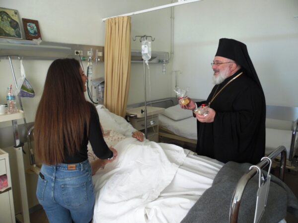 Ο Σεβασμιώτατος στη συνέχεια περιήλθε τους θαλάμους των ασθενών και τους ευχήθηκε ταχεία ανάρρωση στους δε συνοδούς τους υπομονή και ελπίδα. Είχε ωστόσο την ευκαιρία να συναντήσει γιατρούς, νοσηλευτές και μέλη του βοηθητικού προσωπικού από τους υπηρετούντες στο Νοσηλευτικό Καθίδρυμα να τους ερωτήσει για τα προβλήματα που αντιμετωπίζουν και να τους εκφράσει για μια ακόμη φορά την απόλυτη συμπαράστασή του και την αναγνώριση των υπηρεσιών που προσφέρουν.