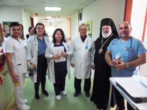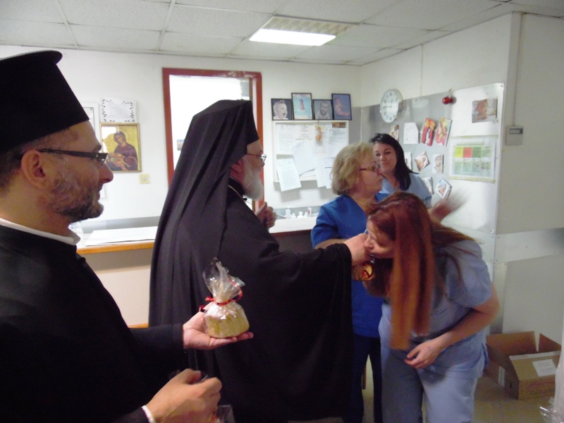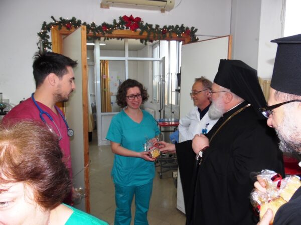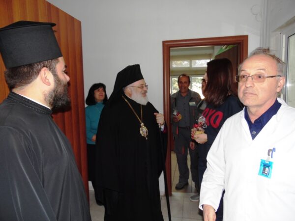 Ο Σεβασμιώτατος στη συνέχεια περιήλθε τους θαλάμους των ασθενών και τους ευχήθηκε ταχεία ανάρρωση στους δε συνοδούς τους υπομονή και ελπίδα. Είχε ωστόσο την ευκαιρία να συναντήσει γιατρούς, νοσηλευτές και μέλη του βοηθητικού προσωπικού από τους υπηρετούντες στο Νοσηλευτικό Καθίδρυμα να τους ερωτήσει για τα προβλήματα που αντιμετωπίζουν και να τους εκφράσει για μια ακόμη φορά την απόλυτη συμπαράστασή του και την αναγνώριση των υπηρεσιών που προσφέρουν.