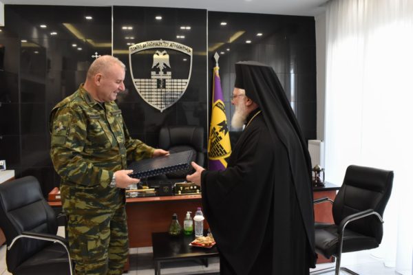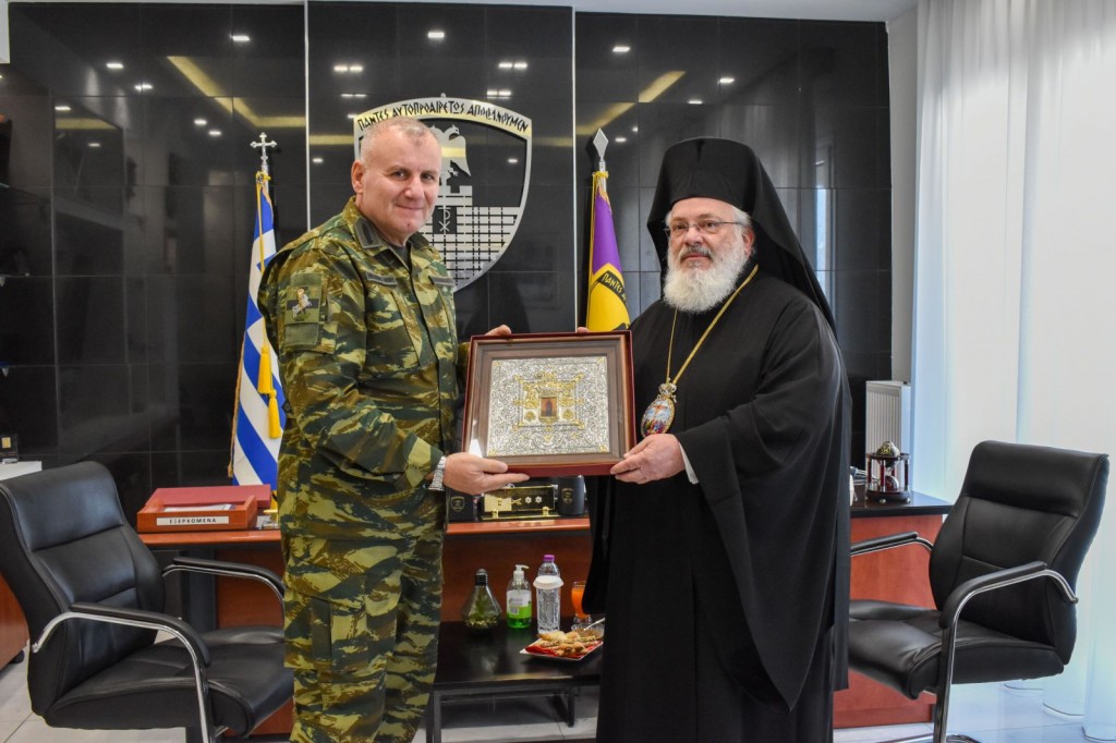 Ο Σεβασμιώτατος με το Στρατηγό για μία ακόμη φορά επιβεβαίωσαν τις κοινές αξίες που υπηρετούν οι Ένοπλες Δυνάμεις και η Εκκλησία και διαπίστωσαν ότι η συνεργασία τους σε διάφορους τομείς είναι λίαν επωφελής για την τοπική κοινωνία. Ο Σεβασμιώτατος με θερμές και εγκάρδιες ευχές προς τον νέο Διοικητή της Μεραρχίας προσέφερε εικόνα της Παναγίας, προκειμένου η Υπέρμαχος Στρατηγός του Γένους να ευλογεί το έργο του και να κατευθύνει την ευθυνοφόρο διακονία του στο Στράτευμα.