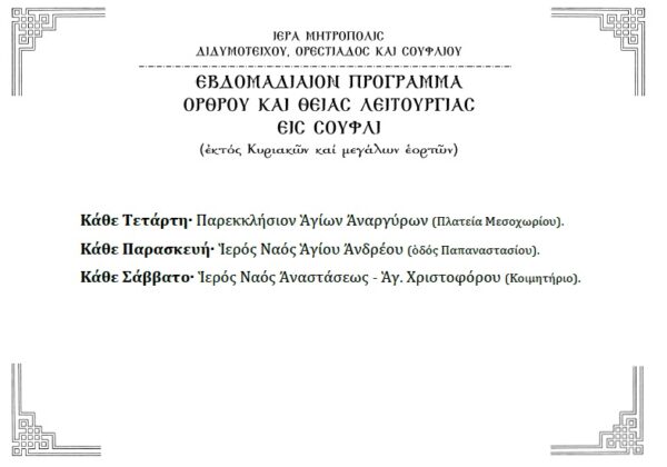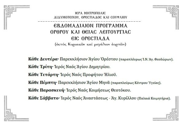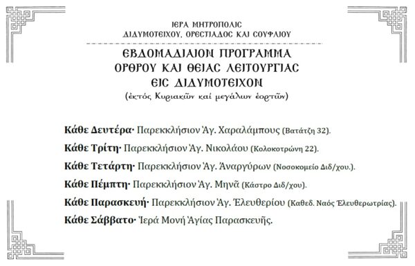 Εβδομαδιαία Προγράμματα Θείων Λειτουργιών σε Διδυμότειχο, Ορεστιάδα και Σουφλί, καθώς αυτά ανακοινώνονται εκ μέρους της Ιεράς Μητροπόλεως Διδυμοτείχου, Ορεστιάδος και Σουφλίου.