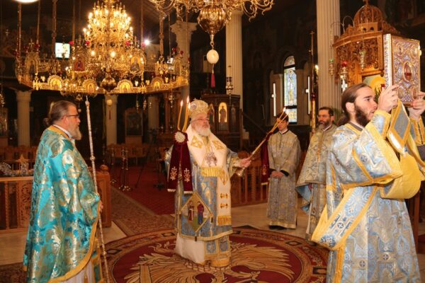 Ειδικότερα την Τετάρτη, 25η Μαρτίου 2020, ο Σεβασμιώτατος ιερούργησε επί τη εορτή του Ευαγγελισμού της Θεοτόκου και προέστη της Δοξολογίας επί τη εθνική εορτή και την Παρασκευή, το εσπέρας, χοροστάτησε στην ακολουθία των Χαιρετισμών και έψαλε την Γ´ Στάση.