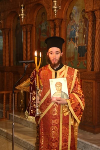 Τον Σεβασμιώτατο στη Θεία Λειτουργία πλαισίωσαν ο Αρχιερατικός Επίτροπος Ορεστιάδος, Αρχιμανδρίτης του Οικουμενικού Θρόνου Βαρθολομαίος Αστεριάδης, ο εφημέριος του Ναού Πρωτοπρεσβύτερος Παναγιώτης Σαββόπουλος και ο νεαρός Διάκονος Ορέστης, ο οποίος φέρει το όνομα του τιμωμένου αγίου.
