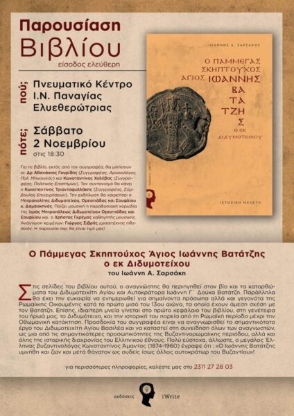 18:30 : Παρουσίασις του πρότριτα εκδοθέντος πονήματος του κ. Ιωάννη Σαρσάκη «Ο Πάμμεγας σκηπτούχος άγιος Ιωάννης Βατάτζης, ο εκ Διδυμοτείχου» εις το πνευματικόν Κέντρον του Ιερού Καθεδρικού Ναού Παναγίας Ελευθερωτρίας Διδυμοτείχου, αίθουσα “Χρόνης Αηδονίδης”.