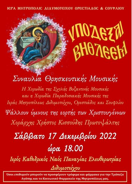 Αφ’ εσπέρας, στον Ιερό Καθεδρικό Ναό Παναγίας Ελευθερωτρίας Διδυμοτείχου, με πολλή επιτυχία, πραγματοποιήθηκε Χριστουγεννιάτικη Συναυλία, με τον τίτλο «Υπόδεξαι Βηθλεέμ», στην οποία συμμετείχαν η Χορωδία της Σχολής Βυζαντινής Μουσικής και η Χορωδία Παραδοσιακής Μουσικής, αμφότερες της Ιεράς Μητροπόλεως, με Χοράρχη τον Πρωτοψάλτη του Ιερού Καθεδρικού Ναού και Καθηγητή της Βυζαντινής Μουσικής Χρήστο Κισσούδη. Η πρώτη των χορωδιών απέδωσε εκκλησιαστικούς ύμνους της εορταστικής αυτής περιόδου και η δεύτερη παραδοσιακά κάλαντα από διάφορα μέρη της Πατρίδας μας.