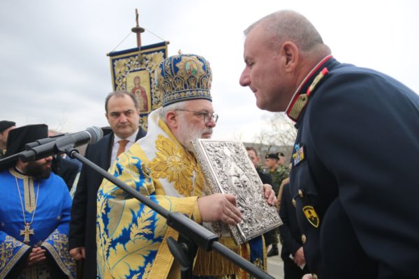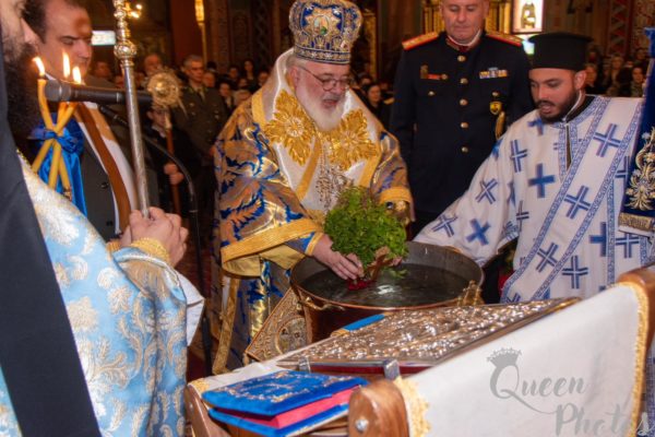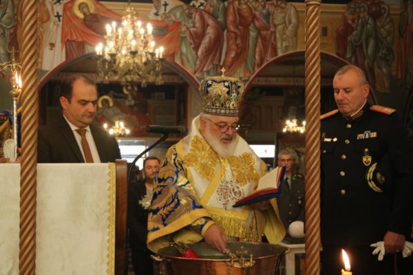 Στη σύντομη ομιλία του ο Σεβασμιώτατος αφορμώμενος από το αποστολικό «Ἐπεφάνη γὰρ ἡ χάρις τοῦ Θεοῦ ἡ σωτήριος πᾶσιν ἀνθρώποις» (Τίτ. 2,11) τόνισε μεταξύ άλλων· «Η εορτή των Θεοφανείων αποτελεί την απαρχή του σωτηριώδους και απολυτρωτικού έργου του Κυρίου……. Παράλληλα με τον καθαγιασμό των υδάτων, εφόσον το ύδωρ είναι η βάση της ζωής για όλη τη δημιουργία, αγιάζεται όλη η φύση. Η κτίσις με την ανθρώπινη αμαρτία «συστενάζει καὶ συνωδίνει ἄχρι τοῦ νῦνʺ (Ρωμ. 8,22) μέσα στη φθορά και στο θάνατο. Ο Μέγας Αγιασμός που τελούμε σήμερα και τον οποίο μεταλαμβάνουμε και με τον οποίο ραντίζουμε τον υλικό κόσμο νοηματοδοτεί την απελευθέρωση της δημιουργίας από τη φθορά, την ανάπλαση και την αναγέννησή της…
