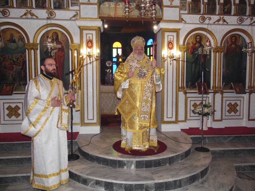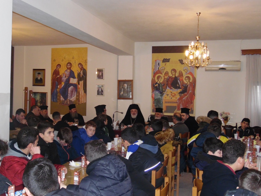 Ο Σεβασμιώτατος προ του πέρατος της Θείας Λειτουργίας καλωσόρισε τους φιλοξενουμένους με θερμά λόγια και χαιρέτησε τον πιστό λαό, που εκκλησιάσθηκε παρά το δριμύ ψύχος και την χιονόπτωση, με λόγια αγάπης. Κλείνοντας την προσλαλιά του ο Σεβασμιώτατος σημείωσε·«Ο Ιησούς Χριστός με την ενανθρώπησή Του έδωσε στον άνθρωπο την δυνατότητα να επιστρέψει στην πατρική του οικία, το χαμένο Παράδεισο. Ο Πατήρ γεμάτος αγάπη άνοιξε την αγκαλιά Του και δίδει στον παρεκτραπέντα υιό τον ασπασμό της ειρήνης· τον εισάγει στο πατρικό σπίτι, την Εκκλησία· του δίδει το δαχτυλίδι της υιοθεσίας· του φορεί δια του αγίου Βαπτίσματος την στολή την πρώτη, τη στολή του Αγίου Πνεύματος. Ακόμα ο Πατήρ θύει με τη Θεία Ευχαριστία τον μόσχο το σιτευτό, του προσφέρει το Σώμα και το Αίμα του Αμνού του Θεού, του «αίροντος τήν αμαρτίαν του κόσμου». Ζώντας δε μέσα στην Εκκλησία, στην οικία του Πατρός, ο άνθρωπος πανηγυρίζει και ευφραίνεται, γιατί σε αυτήν «κοινή των επουρανίων καί των επιγείων συγκροτείται πανήγυρις, μία ευχαριστία, εν αγαλλίαμα, μία ευφρόσυνος χοροστασία», κατά τον Ιερό Χρυσόστομο. Όλα αυτά σημαίνουν ότι ο θάνατος, ο πόνος και η φθορά είναι το αποτέλεσμα της ασωτίας, της αυτονόμησης του ανθρώπου από το Θεό. Ενώ η αφθαρσία, η αθανασία, η αιωνιότης είναι καρποί μετανοίας και κοινωνίας με το Θεό. Γι’ αυτό ας μοιάσουμε με τον άσωτο υιό, που δεν ήταν άσωτος μόνο στην αμαρτία, αλλά και πρόθυμος στην μετάνοια, για να αποκαταστήσουμε την αμαυρωθείσα από την παρεκτροπή φύση μας στο πρωτόκτιστο κάλλος, με το οποίο μας στόλισε ο Δημιουργός».