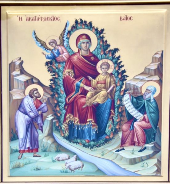 »Ο θεόπτης Μωϋσής όταν είδε την Βάτο να φλέγεται και να μην καίεται είπε “διαβάς… ὄψομαι τό μέγα ὅραμα τοῦτο” (Εξ. 3,2). Η πορεία αυτή η προς την Αγία Βάτο, κατά τον άγιο Κύριλλο Αλεξανδρείας, έχει διαχρονική διάσταση και νοηματοδοτεί το πέρασμα από τον χρόνο της Παλαιάς Διαθήκης στον χρόνο της Καινής. Όπως η φλεγόμενη και μη κατακαιομένη Βάτος έτσι και η Παρθένος Μαρία, αν και γεννά το Φως, εν τούτοις παραδόξως δεν φθείρεται. Αυτήν, λοιπόν, προσκυνούμε σήμερα, που σώζει τον λαό του Θεού από τα δεσμά των Φαραώ και των παθών για να τον οδηγήσει στη Γη της Επαγγελίας, τη Βασιλεία των Ουρανών».