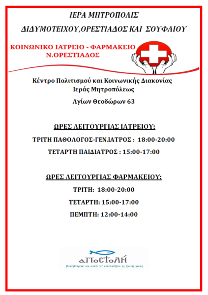 Ώρες λειτουργίας του Κοινωνικού Ιατρείου – Φαρμακείου Ν. Ορεστιάδας της Ιεράς Μητροπόλεως Διδυμοτείχου, Ορεστιάδος και Σουφλίου, συμφώνως με το κάτωθι επισυναφθέν Πρόγραμμα: