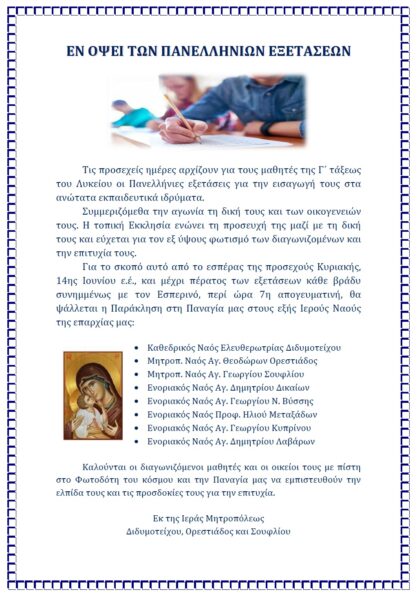 Παρακλήσεις στην Υπεραγία Θεοτόκο θα ψάλλονται αμέσως μετά τον Εσπερινό μέχρι πέρατος των πανελληνίων εξετάσεων στους εξής Ιερούς Ναούς της Ιεράς Μητροπόλεως Διδυμοτείχου, Ορεστιάδος και Σουφλίου: Καθεδρικός Ναός Ελευθερώτριας Διδυμοτείχου, Μητρ. Ναός Αγίων Θεοδώρων Ορεστιάδος, Μητρ. Ναός Αγ. Γεωργίου Σουφλίου, Αγ. Δημητρίου Δικαίων, Αγ. Γεωργίου Ν. Βύσσης, Προφ. Ηλίου Μεταξάδων, Αγ. Γεωργίου Κυπρίνου και Αγίου Δημητρίου Λαβάρων.
