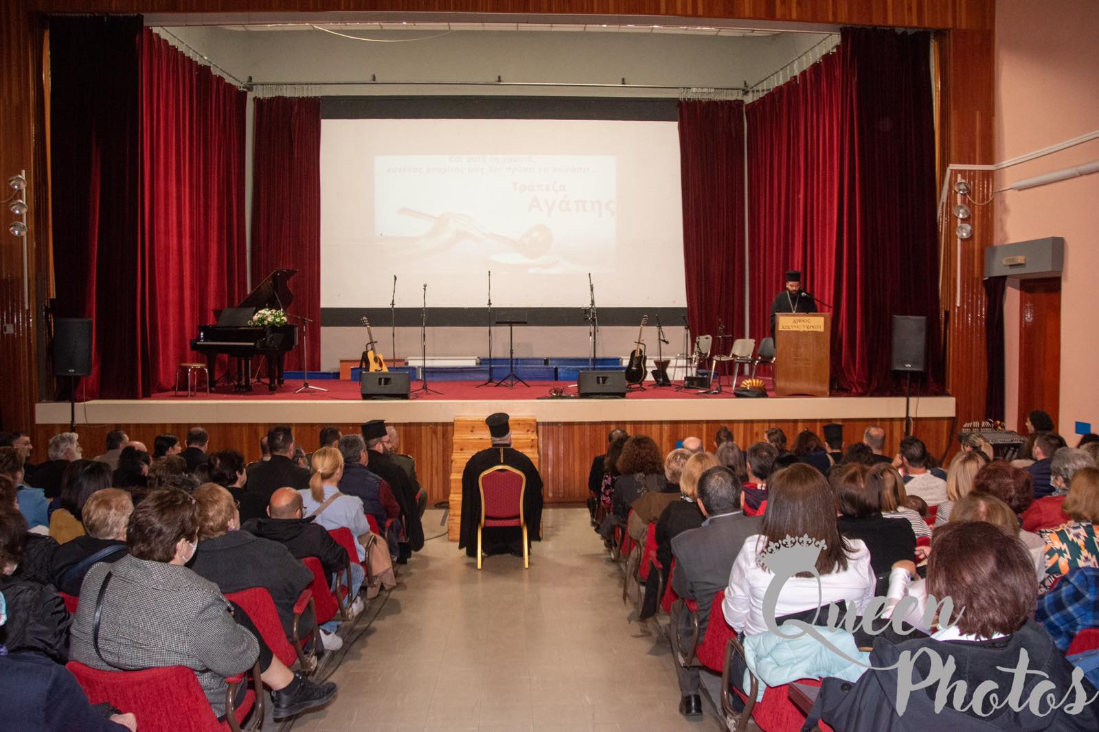 Την εκδήλωση άνοιξε με σύντομη προσφώνηση ο π Αρχιμ. Κύριλλος Κολτσίδης, ο οποίος, μεταξύ άλλων, σημείωσε· «Οι Απόστολοι και στη συνέχεια οι Πατέρες της Εκκλησίας μας είδαν την φιλανθρωπία ως μορφή ιερουργίας, γι’ αυτό και επέλεξαν τους διακόνους και τις διακόνισσες για να τους συνεπικουρούν στο έργο της έμπρακτης συμπαράστασης και αγάπης προς τους εμπερίστατους αδελφούς. Χαρακτηριστικό είναι ότι ο Άγιος Ιωάννης ο Χρυσόστομος αναφέρει σχετικά ότι υπάρχουν δύο είδη Λειτουργίας: η Θεία Λειτουργία ως μυστήριο, που τελείται επί της Αγίας Τραπέζης και η Λειτουργία μετά την Θεία Λειτουργία, ως έκφραση αλληλεγγύης, στην οποία Τράπεζα προσφοράς γίνεται κάθε ψυχή που βρίσκεται σε ανάγκη και δέχεται βοήθεια.
