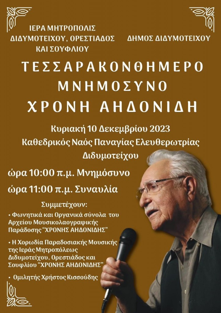 Επι τη συμπληρώσει τεσσαράκοντα ημερών από της προς Κύριον εκδημίας του διακεκριμένου μουσικού και ερμηνευτή της Θρακιώτικης παράδοσης Χρόνη Αηδονίδη, η Ιερά Μητρόπολη Διδυμοτείχου, Ορεστιάδος και Σουφλίου σε συνεργασία με τον Δήμο Διδυμοτείχου τέλει Μνημόσυνο υπέρ αναπαύσεως της ψυχής του, την Κυριακή 10 Δεκεμβρίου, στον Ιερό Καθεδρικό Ναό Παναγίας Ελευθερωτρίας Διδυμοτείχου.