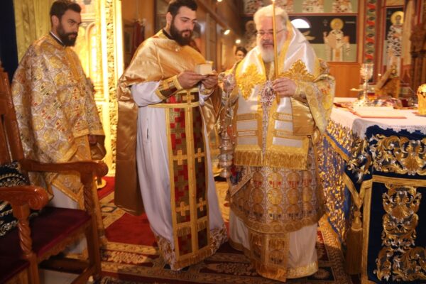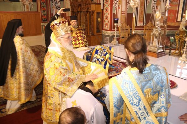 Προ του πέρατος της Θείας Λειτουργίας ο Σεβασμιώτατος με βαθειά συγκίνηση συνεχάρη τον νεωστί χειροτονηθέντα Πρεσβύτερο και τους κατά σάρκα γονείς του Πρωτοπρ. Απόστολο Καλφόπουλο και Πρεσβυτέρα Δέσποινα, που παραδίδουν στην Εκκλησία ένα από τα τρία άρρενα τέκνα τους, και την σύζυγό του νέου Ιερέως Πρεσβυτέρα Ελευθερία, που χωρίς δισταγμούς συνηγόρησε για την χειροτονία του.