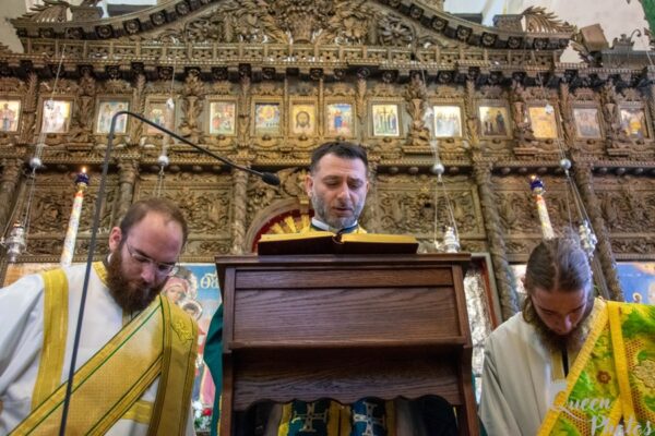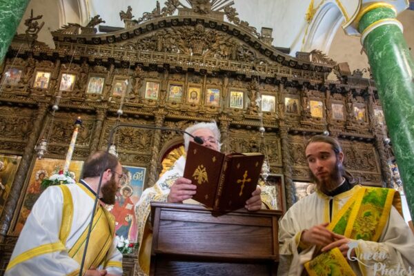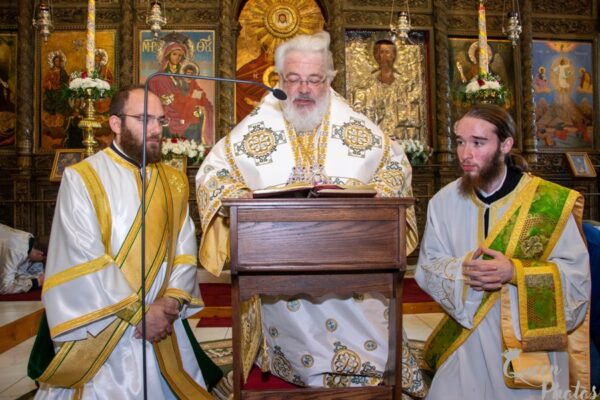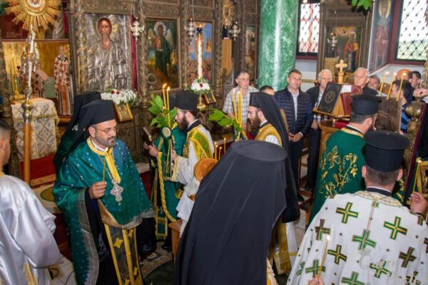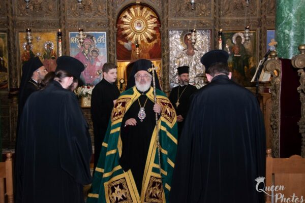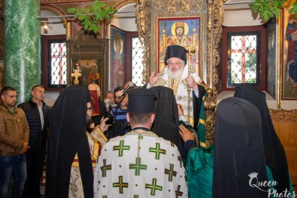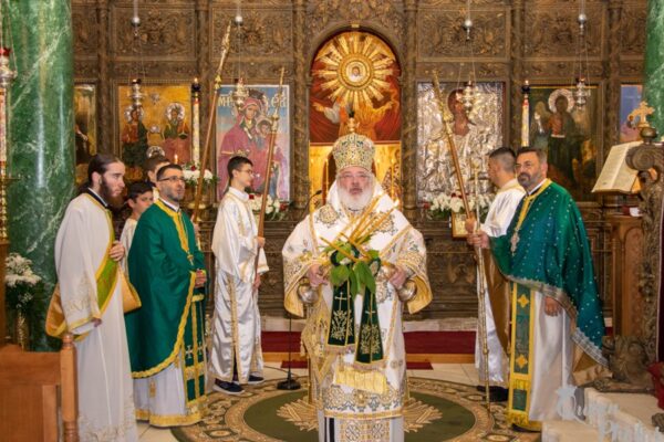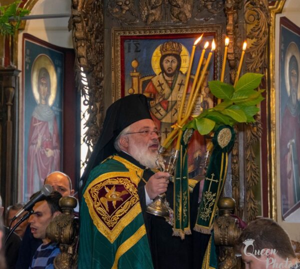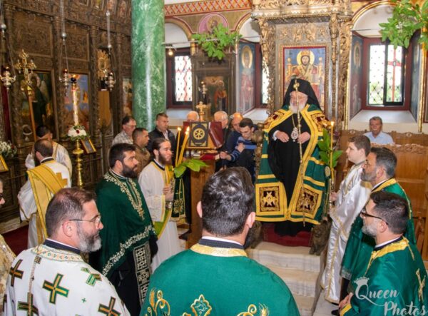 Το πρωί της Κυριακής της Πεντηκοστής του Όρθρου και της Θείας Λειτουργίας, στον ίδιο Ναό, προέστη ο Σεβασμιώτατος, ο οποίος σε Εγκύκλιο του επί τη εορτή της Πεντηκοστής, μεταξύ άλλων, γράφει· «…Ἡ Ἐκκλησία κυοφορεῖ τόν Ἀληθινό Παράκλητο πάντοτε καί χωρίς διακοπές. Ὅπως ἡ κυρία Θεοτόκος κυοφόρησε τό Χριστό καί αὐτό τήν ἀνέδειξε Μητέρα τοῦ Κόσμου, οὕτω καί ἡ Ἐκκλησία κυοφορεῖ τόν Παράκλητο, τό Πνεῦμα τῆς Ἀλήθειας, καί αὐτό τή διακρίνει ἀπό κάθε ἄλλη θρησκευτική δομή, ἀφοῦ Αὐτή γίνεται τό δοχεῖο τῆς Χάριτος καί τοῦ Ἁγιασμοῦ· ὁ μοναδικός χῶρος ὅπου οἱ ἄνθρωποι βρίσκουν ζωή καί σωτηρία. Ἡ Ἐκκλησία ὑπάρχει μόνον ἐπειδή ὑπάρχει τό Ἅγιο Πνεῦμα. Μία Ἐκκλησία χωρίς Ἅγιο Πνεῦμα δέν εἶναι ἡ Μία, Ἁγία, Καθολική καί Ἀποστολική Ἐκκλησία. Εἶναι μία ὁμάδα ἀνθρώπων, ἐνδεχομένως καλῶν καί ἠθικῶν, πού ἀναζητοῦν τήν ἀλήθεια καί τή σωτηρία τους μέσα στό σκοτάδι τῆς ἄγνοιας καί στό ψέμα τοῦ ἀνθρώπινου ἐγωϊσμοῦ… Τό ἔργο τοῦ Ἁγίου Πνεύματος μέσα στήν Ἐκκλησία εἶναι νά κάνει τίς ἐπαγγελίες καί τίς ὑποσχέσεις τοῦ Χριστοῦ πραγματικότητα. Χωρίς τό Ἅγιο Πνεῦμα ὁ λόγος τοῦ Ἰησοῦ θά ἦταν ὄμορφη διδασκαλία, συμπαθής φιλοσοφία, πού θά χωνεύονταν ἀπό τόν ἀδηφάγο χρόνο καί θά παρέμενε ἁπλῶς καταχωρημένη σέ κάποια ξεχασμένα βιβλία σκονισμένων βιβλιοθηκῶν. Ἡ δύναμη καί ἡ ἐνέργεια τοῦ Ἁγίου Πνεύματος μετατρέπουν τόν Χριστό σέ ζωή καί τόν λόγο Του σέ ἐμπειρία καί βίωμα. Μόνο στήν Ἐκκλησία, ὅπου ἀναπαύεται τό Πνεῦμα τό Ἅγιον, ὁ Χριστός εἶναι Σωτήρας καί Λυτρωτής. Ἐκτός Ἐκκλησίας ὁ Χριστός εἶναι ἕνας διδάσκαλος, ἕνας φιλόσοφος, ἕνα ἱστορικό πρόσωπο ἀνάμεσα σ’ ὅλα τά ὑπόλοιπα πού κάποτε ἔλαμψαν στό προσκήνιο τῆς ἱστορίας… Σήμερα, λοιπόν, αὐτή ἡ μεγάλη ἑορτή τῆς Πεντηκοστῆς, ἀγαπητοί, ἄς γίνει ἀφορμή μετανοίας καί φρονήσεως. Ἄς σκύψουμε μέ ἀληθινή ταπείνωση ἐνώπιον τοῦ γεγονότος τῆς ἐπιδημίας τοῦ Παρακλήτου γιά νά ἀξιωθοῦμε νά μᾶς ἀγγίξει ἡ πύρινη γλώσσα καί ἡ αὔρα τῆς παρουσίας Του. Τότε ἡ φωτιά τῆς δικῆς Του δύναμης θά μᾶς ὁδηγήσει στά μονοπάτια τῆς ἀληθινῆς ζωῆς, τῆς τωρινῆς καί τῆς αἰώνιας πού ἀναμένεται, θά ἐπουλώσει στίς μικρές καί μεγάλες ἀδυναμίες μας, θά μᾶς ἐνδυναμώσει γιά νά σηκωθοῦμε ἀπό τίς πτώσεις μας καί θά μᾶς ἁγιάζει διαρκῶς μέ τήν Χάρη Του».