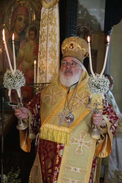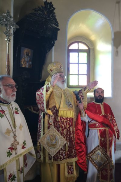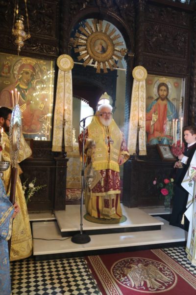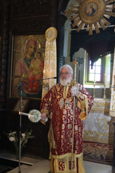 Ο Σεβασμιώτατος κατά την απόλυση αφορμώμενος από τα μαρτύρια, τα οποία υπέστη ο Άγιος, τόνισε· «Στον απόηχο της Λαμπροφόρου εορτής της Αναστάσεως του Κυρίου μας και όχι τυχαία τιμούμε σήμερα τον Μεγαλομάρτυρα Άγιο Γεώργιο, διότι οι άγιοι της πίστεώς μας είναι μάρτυρες του Σταυρού και της Αναστάσεως. Συγκεκριμένα, ο βίος και το μαρτύριο του Μεγαλομάρτυρος Αγίου μάς υπενθυμίζει ότι η ζωή μας αποκτά αυθεντικότητα όταν συμπορεύεται με τη ζωή, το Πάθος και την Ανάσταση του Χριστού. Τούτο σημαίνει θάνατο και Ανάσταση· θάνατο καθημερινό του παλαιού εαυτού μας και αναγέννηση- ανάσταση ενός νέου, κατά Χριστόν κτισθέντος».