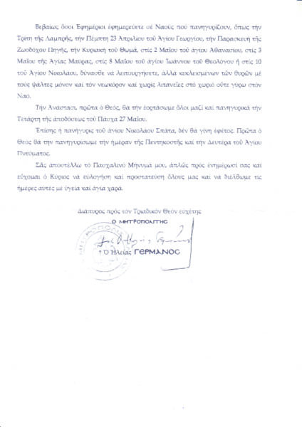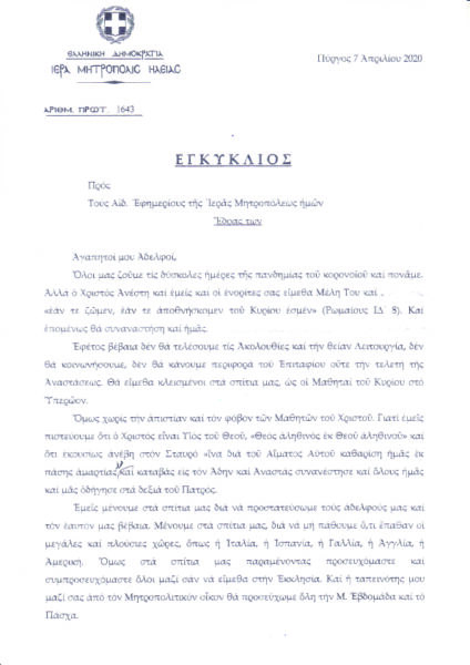 Εγκύκλιο Μήνυμα εξέδωσε ο Μητροπολίτης Ηλείας, κ. Γερμανός, όπου καθως χαρακτηριστικά αναφέρει: “Εφέτος, βέβαια, δε θα τελέσουμε τις Ακολουθίες, τη Θεία Λειτουργία, δε θα κοινωνήσουμε, δε θα κάνουμε περιφορά του Επιταφίου, ούτε την τελετή της Αναστάσεως. Θα είμεθα κλεισμένοι στα σπίτια μας, ως οι Μαθηταί του Κυρίου στο Υπερώον”. Σε άλλο σημείο αναφέρει: “Την Ανάσταση, πρώτα ο Θεός, θα την εορτάσουμε όλοι μαζί και πανηγυρικά την Τετάρτη της Αποδόσεως του Πάσχα, 27 Μαϊου”.