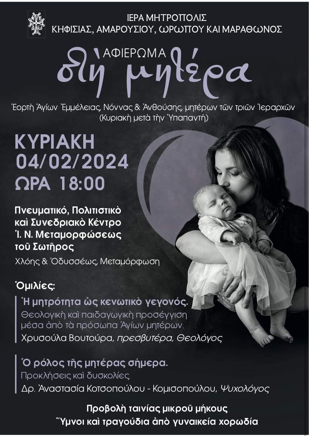 Η Ιερά Μητρόπολη Κηφισίας, Αμαρουσίου, Ωρωπού και Μαραθώνος με την ευκαιρία της εορτής των μητέρων των Τριών Ιεραρχών, Εμμελείας, Νόννης και Ανθούσης διοργανώνει, σήμερα στις 18:00, εορταστική εκδήλωση στο Πνευματικό, Πολιτιστικό και Συνεδριακό Κέντρο του Ιερού Ναού Μεταμορφώσεως του Σωτήρος Δήμου Μεταμόρφωσης (οδός Χλόης και Οδυσσέως) αφιερωμένη στην μητέρα και τον θεσμό της οικογένειας.