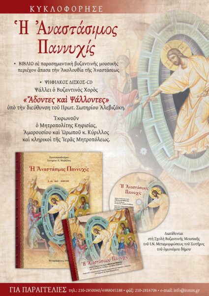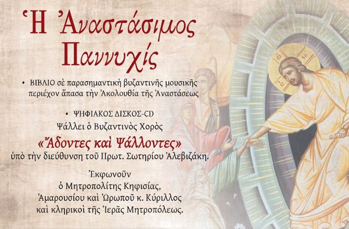 Η Αναστάσιμος Παννυχίς – ΒΙΒΛΙΟ σε παρασημαντική βυζαντινής μουσικής με άπασα την Ακολουθία της Αναστάσεως – Ψηφιακός Δίσκος – CD όπου ψάλλει ο Βυζαντινός Χορός “Άδοντες και Ψάλλοντες”. Εκφωνούν ο Μητροπολίτης Κηφισίας και Ωρωπού, κ. Κύριλλος, και κληρικοί της Ιεράς Μητροπόλεως.