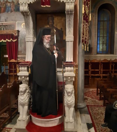 Προ της απολύσεως, ο Σεβασμώτατος, αφού επεσήμανε την εφετινή διαφορετική λειτουργική τυπική διάταξη(καθώς κάθε οκτώ χρόνια τελείται Εσπερινός των Χριστουγέννων), ομίλησε αφορμώμενος από το ποίημα «Οι πόνοι της Παναγίας» του Κ. Βάρναλη, τονίζοντας την αχαριστία μας απέναντι στις ποικίλες ευεργεσίες του Θεού.