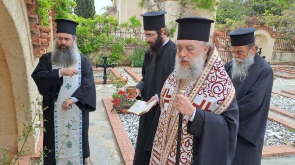 Ακολούθως ο Σεβασμιώτατος κ. Κύριλλος τέλεσε Ιερό Τρισάγιο για τον κεκοιμημένο προκάτοχό του, μακαριστό Μητροπολίτη Αττικής κυρό Παντελεήμονα (Μπεζενίτη) καθώς και όλους τους κεκοιμημένους αδελφούς που ευβρίσκονται στο Κοιμητήριο της Ιεράς Μονής.