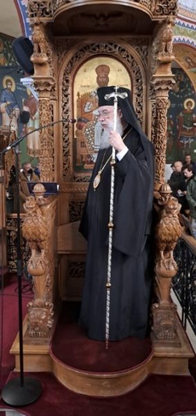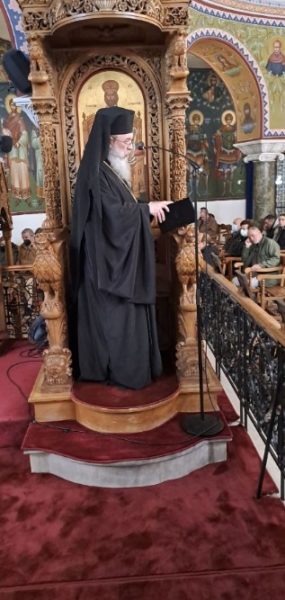 Μετά την απαγγελία της Α’ Στάσεως, ο Σεβασμιώτατος κήρυξε τον θείο λόγο, λαμβάνοντας αφορμή από τον στίχο του τρίτου οίκου των Χαιρετισμών της Υπεραγίας Θεοτόκου «Χαίρε, κλίμαξ επουράνιε, δι’ ής κατέβη ο Θεός· χαίρε, γέφυρα μετάγουσα τους εκ γης πρός ουρανόν.»