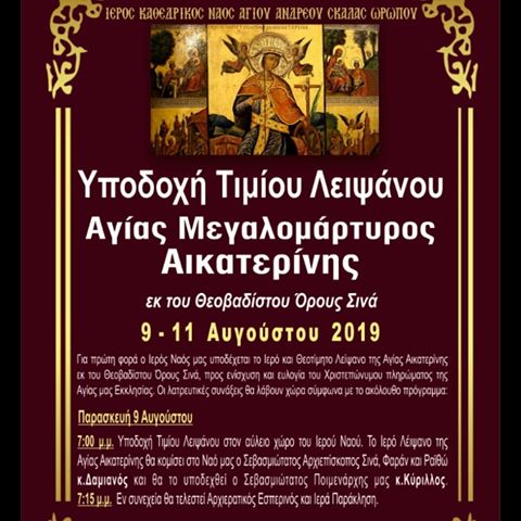 Το ιερό Λείψανο της Αγίας Αικατερίνης από το Όρος Σινά, αναμένεται στις 9 Αυγούστου 2019, στον Ιερό Ναό του Αγίου Ανδρέα στην Σκάλα Ωρωπού.