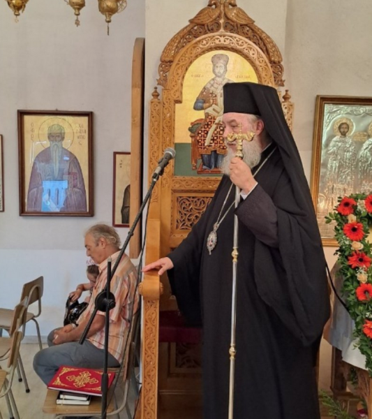 Στο πέρας των Αποστίχων, ο Σεβασμιώτατος Μητροπολίτης κ. Κύριλλος ομίλησε στο πολυπληθές εκκλησίασμα αναφερόμενος στο θαύμα της φανερώσεως της Ιεράς Εικόνος του Αγίου Φανουρίου στη νήσο Ρόδο, στο μαρτύριό και στην ομολογία του, υπογράμμισε δε ότι η θεολογία δεν είναι απλά μια επιστήμη ή συσσωρευμένη γνώση, αλλά βίωμα. Ακολούθησε λιτάνευση στους δρόμους της περιοχής.