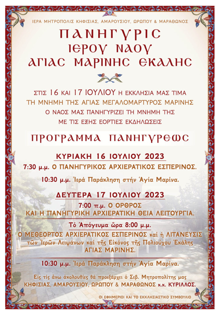 Στις 16 και 17 Ιουλίου η Εκκλησία τιμά τη μνήμη της Αγίας Μεγαλομάρτυρος Μαρίνης. Ο ομώνυμος Ναός πανηγυρίζει τη μνήμη της Αγίας με μία σειρά από εορταστικές εκδηλώσεις. Το διήμερο 19 και 20 Ιουλίου πανηγυρίζει το Παρεκκλήσι του Προφήτη Ηλία Επισκοπείου Ιεράς Μητρόπολης Κηφισίας, Αμαρουσίου, Ωρωπού και Μαραθώνος.