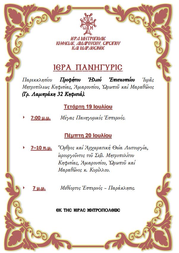 Παρακάτω το πρόγραμμα πανήγυρης του Προφήτη Ηλία Επισκοπείου Κηφισιάς