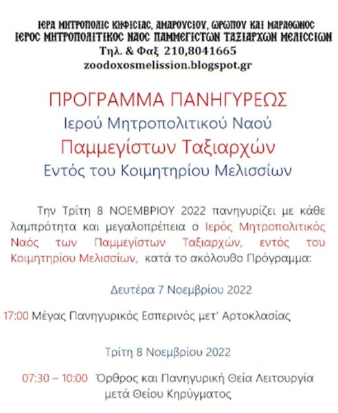 Την Τρίτη 8 Νοεμβρίου πανηγυρίζει με μεγαλοπρέπεια ο Ιερός Μητροπολιτικός Ναός των Παμμεγίστων Ταξιαρχών, της Ιεράς Μητρόπολης Κηφισίας, εντός του Κοιμητηρίου Μελισσίων.