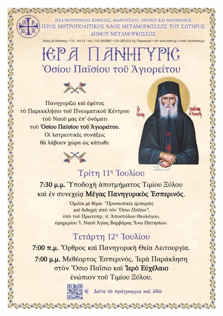 Ενόψει των εορτών της Αγίας Κυριακής και του Οσίου Παϊσίου του Αγιορείτου, η Ιερά Μητρόπολη Κηφισίας, Αμαρουσίου και Ωρωπού γνωστοποιεί το πρόγραμμα των πανηγύρεων σε φερώνυμα παρεκκλήσια της Ιεράς Μητροπόλεως.