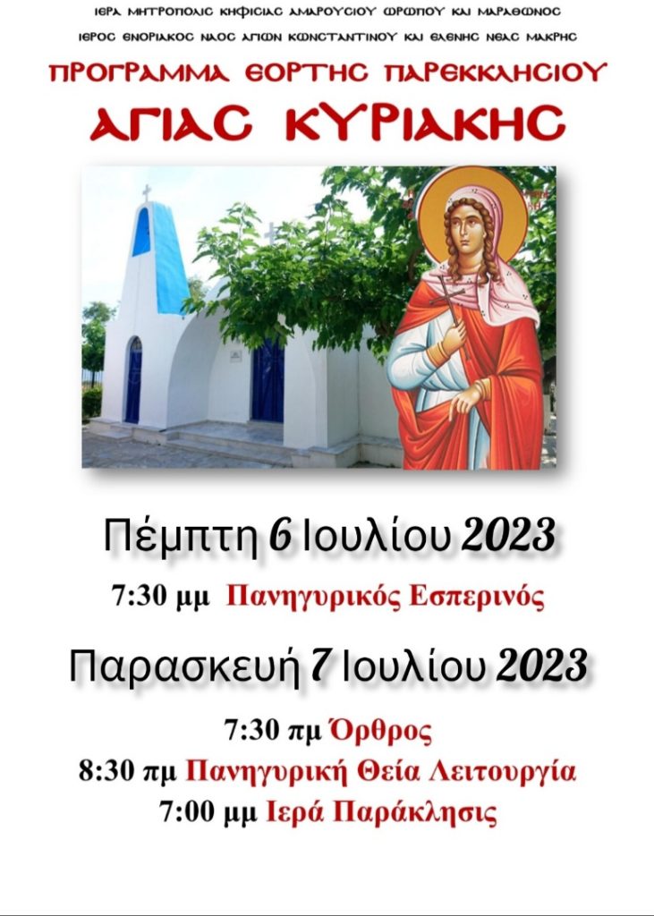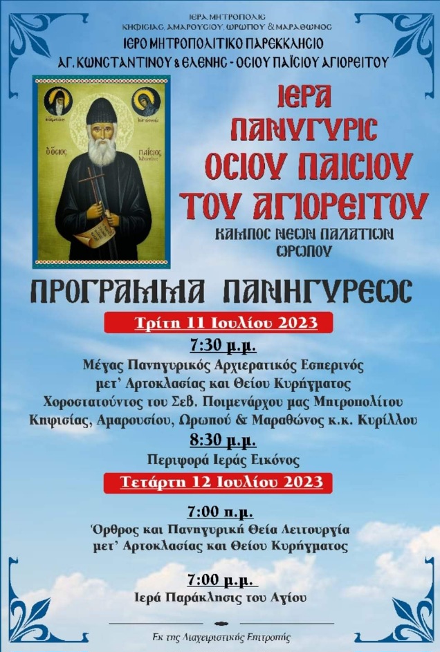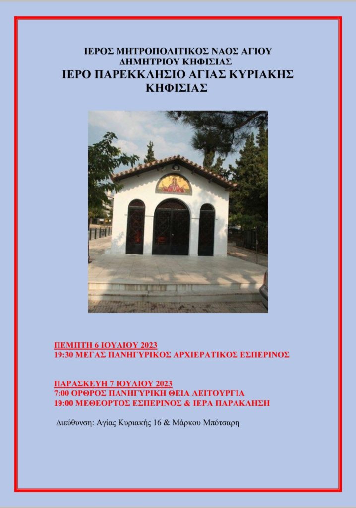 05/07/2023 06/07/2023 Ενόψει των εορτών της Αγίας Κυριακής και του Οσίου Παϊσίου του Αγιορείτου, η Ιερά Μητρόπολη Κηφισίας, Αμαρουσίου και Ωρωπού γνωστοποιεί το πρόγραμμα των πανηγύρεων σε φερώνυμα παρεκκλήσια της Ιεράς Μητροπόλεως. Αναλυτικά: