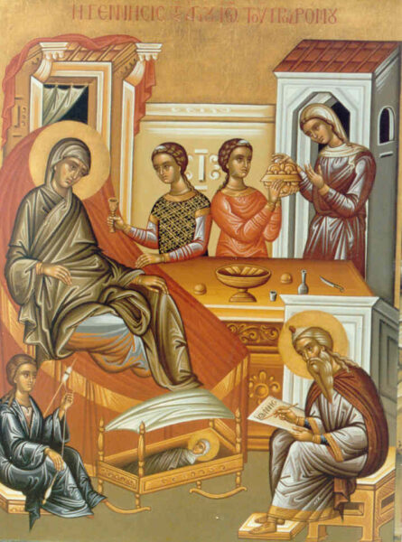 Στο κάτω μέρος της εικόνας άλλη θεραπαινής γνέθει νήμα και με την άκρη του ποδιού της κινεί τον λίκνο, δηλαδή την κούνια του νεογέννητου Ιωάννη. Η κούνια σκεπασμένη με λευκό ύφασμα, φυλάει τον θησαυρό, δηλαδή το βρέφος που θα δώσει τέλος στη σκιά του νόμου και θα οδοποιήσει τήν ημέρα του φωτός και της χάριτος. Ο Ιωάννης είναι τυλιγμένος με τα σπάργανα όπως τα συνηθισμένα βρέφη, αλλά φορεί και φωτοστέφανο. Το πρόσωπό του λάμπει από χάρη, γιατί έχει ήδη γεμίσει από το Αγιο Πνεύμα, όπως προανήγγειλε ο Αγγελος Κυρίου. Δίπλα του, από τα δεξιά βλέπουμε τον πατέρα του τον Ζαχαρία, να κάθεται σε κάθισμα ωραίο, με ταπεινό αλλά και λαμπρό υποπόδιο και να γράφη σε πινακίδα, με τον κάλαμό του, την λέξη Ι ω ά ν ν η ς. Είναι το όνομα που θα δοθεί στο βρέφος.
