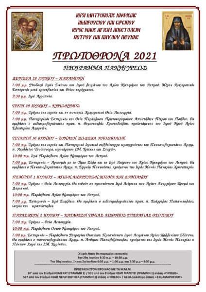 28/06/2021 28/06/2021 Μετά την υποδοχή της Ιεράς Εικόνος και του ιερού λειψάνου του Αγίου Νικηφόρου του λεπρού σήμερα, Δευτέρα 28 Ιουνίου, το απόγευμα στις 7, θα αρχίσει ο Μέγας Αρχιερατικός Εσπερινός μετ’ αρτοκλασίας και θείου κηρύγματος στον Ιερό Ναό Αγίων Αποστόλων Πέτρου και Παύλου Πεύκης προς τιμήν των εορταζόντων Πρωτοκορυφαίων Αποστόλων. Την κυριώνυμο ημέρα της εορτής, δηλ....