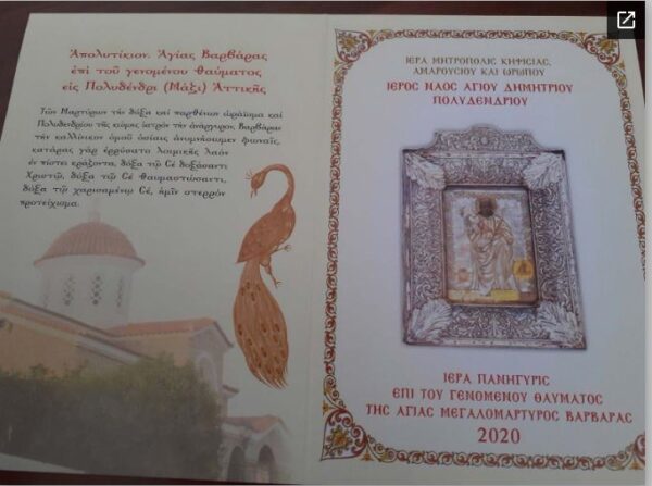 Με θρησκευτική κατάνυξη εορτάστηκε στο Πολυδένδρι Αττικής η ανάμνηση του υπερφυούς θαύματος της Αγίας ενδόξου Μεγαλομάρτυρος Βαρβάρας της θαυματουργού, η οποία το 1917 λύτρωσε το χωριό από την λοιμική ασθένεια της ευλογιάς.