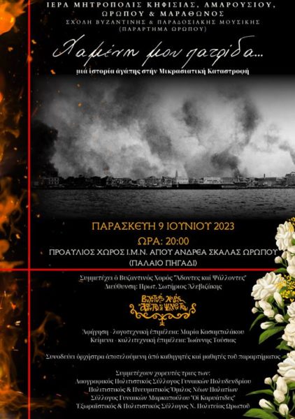 Το παράρτημα Ωρωπού της Σχολής Βυζαντινής & Παραδοσιακής Μουσικής της Ιεράς Μητρόπολις Κηφισίας, Αμαρουσίου, Ωρωπού & Μαραθώνος παρουσιάζει την παράσταση “Χαμένη μου πατρίδα… μια ιστορία αγάπης στην Μικρασιατική Καταστροφή” την Παρασκευή 9 Ιουνίου 2023 & ώρα 20:00 στον προαύλιο χώρο του Ι.Μ.Ν. Αγίου Ανδρέου Σκάλας Ωρωπού (παλαιό πηγάδι).