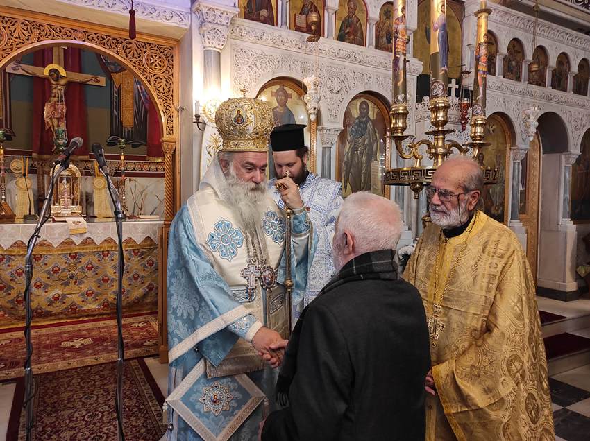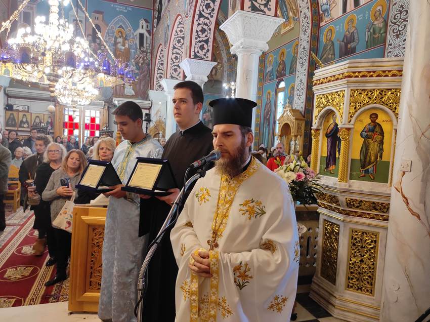 Από την πλευρά Του, ο Σεβασμιώτατος αφού επεσήμανε στο κήρυγμά Του ότι ο μεγαλύτερος ευεργέτης όλων των ανθρώπων είναι ο Κύριος Ιησούς Χριστός, με αφορμή την απόφαση της Ιεράς Συνόδου, όπου την 11η Ιανουαρίου εκάστου έτους γίνεται το μνημόσυνο των ευεργετών των Ιερών Ναών, βράβευσε μετά από πρόταση του Εκκλησιαστικού Συμβουλίου τους κ. Βασίλειο Λαμπαδά και κ. Περικλή και κα. Σμαράγδα Πασχαλίδου, οι οποίοι προσέφεραν μεγάλα χρηματικά ποσά για την αποπεράτωση της αγιογραφίας του Ιερού Ναού.