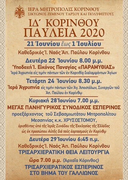 Εχθές, Κυριακή, 21 Ιουνίου 2020, ο Σεβασμιώτατος Μητροπολίτης Κορίνθου κ. Διονύσιος στον Καθεδρικό Ι. Ναό Αποστόλου Παύλου Κορίνθου και ο Θεοφιλέστατος Επίσκοπος Κεγχρεών κ. Αγάπιος στον Ι. Ναό Μεταμορφώσεως του Σωτήρος Κεγχρεών τέλεσαν ταυτόχρονα Αρχιερατικές Θείες Λειτουργίες και κήρυξαν την επίσημη Εκκλησιαστική έναρξη των Εκδηλώσεων των «ΙΔ′ ΚΟΡΙΝΘΟΥ ΠΑΥΛΕΙΩΝ 2020». Σήμερα, δε, στις 8.00 μ.μ. στον Καθεδρικό Ναού Αποστόλου Παύλου υποδέχονται την Ιερά Εικόνα της Παναγίας της «Παραμυθίας», ενώ θα τελεστεί και Ιερά Αγρυπνία εις τιμήν πάντων των εν Κορινθία διαλαμψάντων Αγίων.