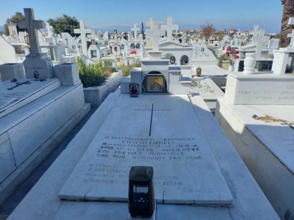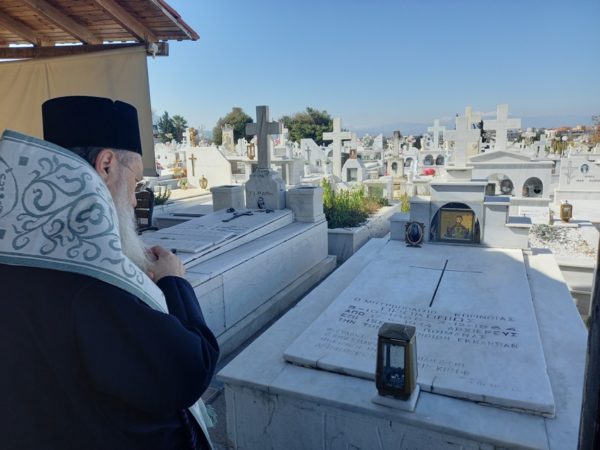 Μετά το πέρας της Θείας Λειτουργίας ο Σεβασμιώτατος μετέβη στο Α’ Κοιμητήριο Κορίνθου όπου τέλεσε Νεκρώσιμο Τρισάγιο επί των τάφων των Προκατόχου του Αρχιερέων μνημονεύοντας όλους τους προ αυτού Μητροπολίτες Κορίνθου ως και τους ευεργετήσαντας την Αποστολική Ιερά Μητρόπολή Κορίνθου και διακονήσαντας σε αυτήν χωρίς να παραλείψει να μνημονεύσει όλους τους Κορινθίους που αναπαύονται σ᾿ αυτό καθώς και πάντας τους κατά πνεύμα και σάρκα οικείους του με επικεφαλής τους μακαριστούς Πνευματικούς του Πατέρες και τους κατά σάρκα γονείς του Γεώργιο και Ασπασία.