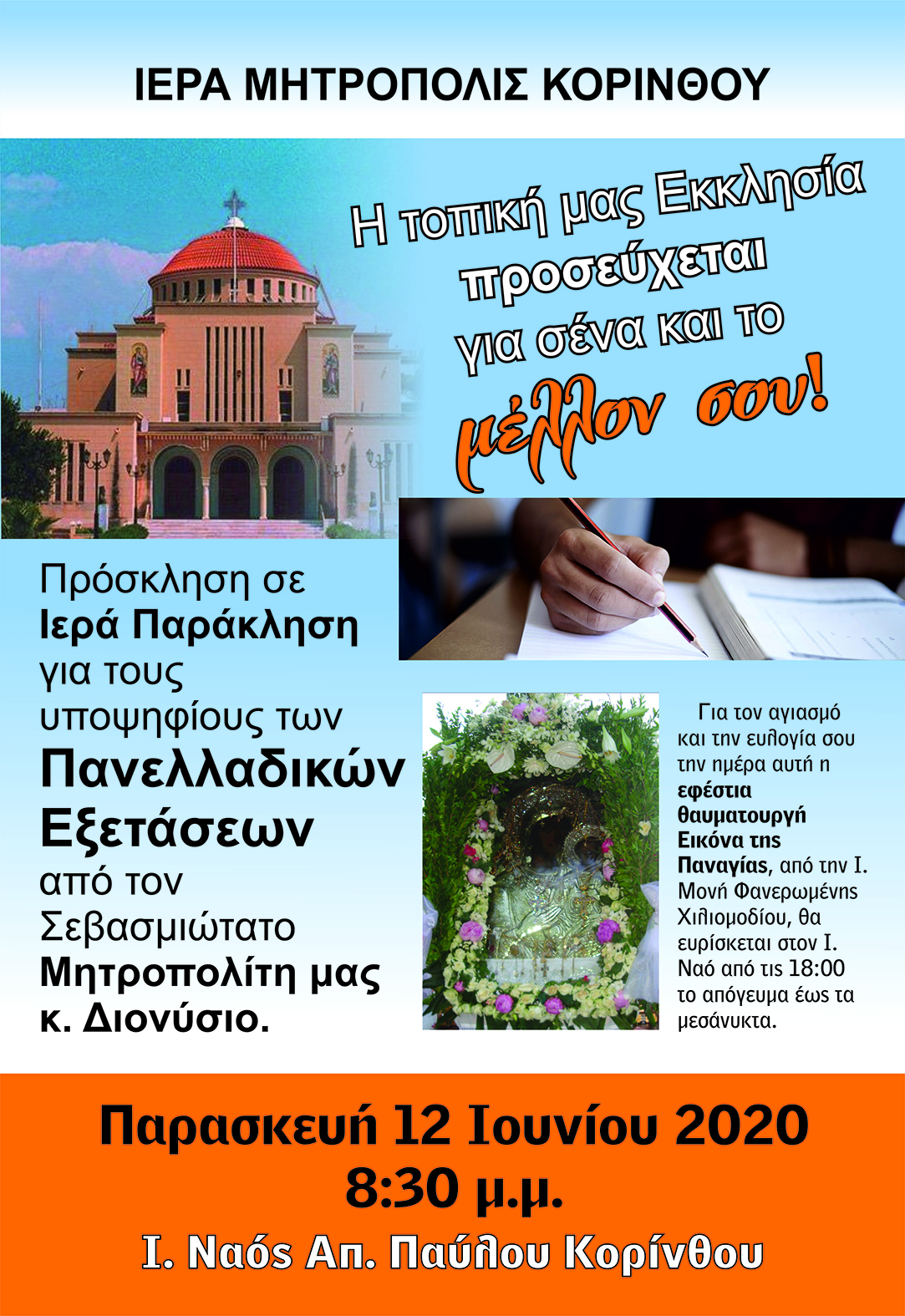 Ιερά Παράκληση για τους υποψηφίους Μαθητές των Πανελλαδικών Εξετάσεων θα τελέσει ο Μητροπολίτης Κορίνθου κ. Διονύσιος, στον Καθεδρικό Ιερό Ναό του Αποστόλου Παύλου Κορίνθου την Παρασκευή 12 Ιουνίου 2020 και ώρα 20:30, πλαισιούμενος υπό των Ιερέων των πόλεων Κορίνθου, Λουτρακίου, Αγίων Θεοδώρων, Ισθμίας, Καλαμακίου, Αρχαίας Κορίνθου και Λεχαίου.