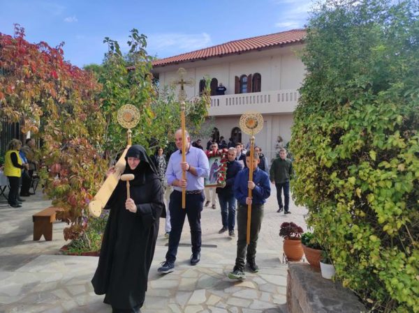 Στην συνέχεια ακολούθησε μικρά Λιτανεία της Ιεράς Εικόνος του Αγίου Γερασίμου και της «εμβάδος» Αυτού, που φυλάσσεται στο Ιερό Ησυχαστήριο. Η Αδελφότης του Ιερού Ησυχαστηρίου προσέφερε «κεράσματα» και παρέθεσε τράπεζα στους ευλαβείς προσκυνητές.